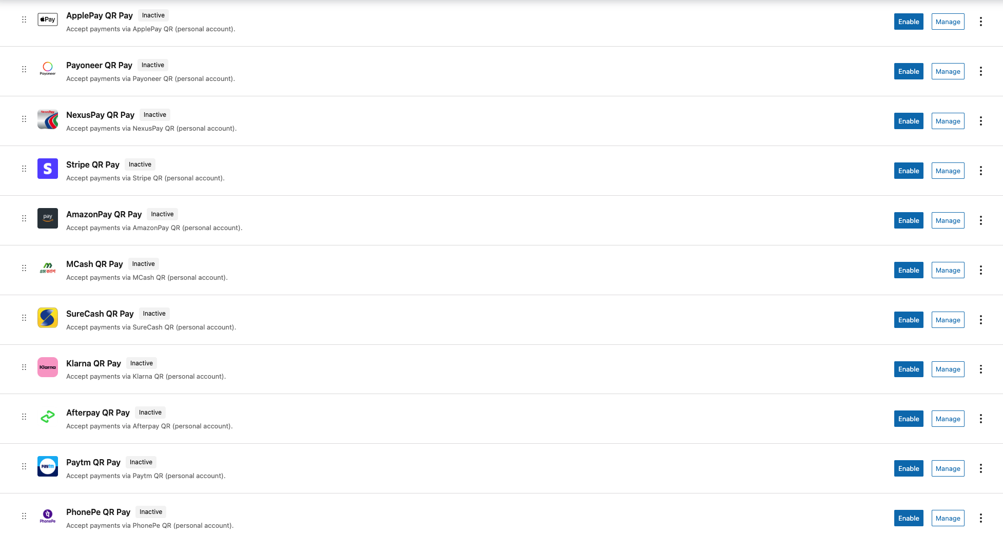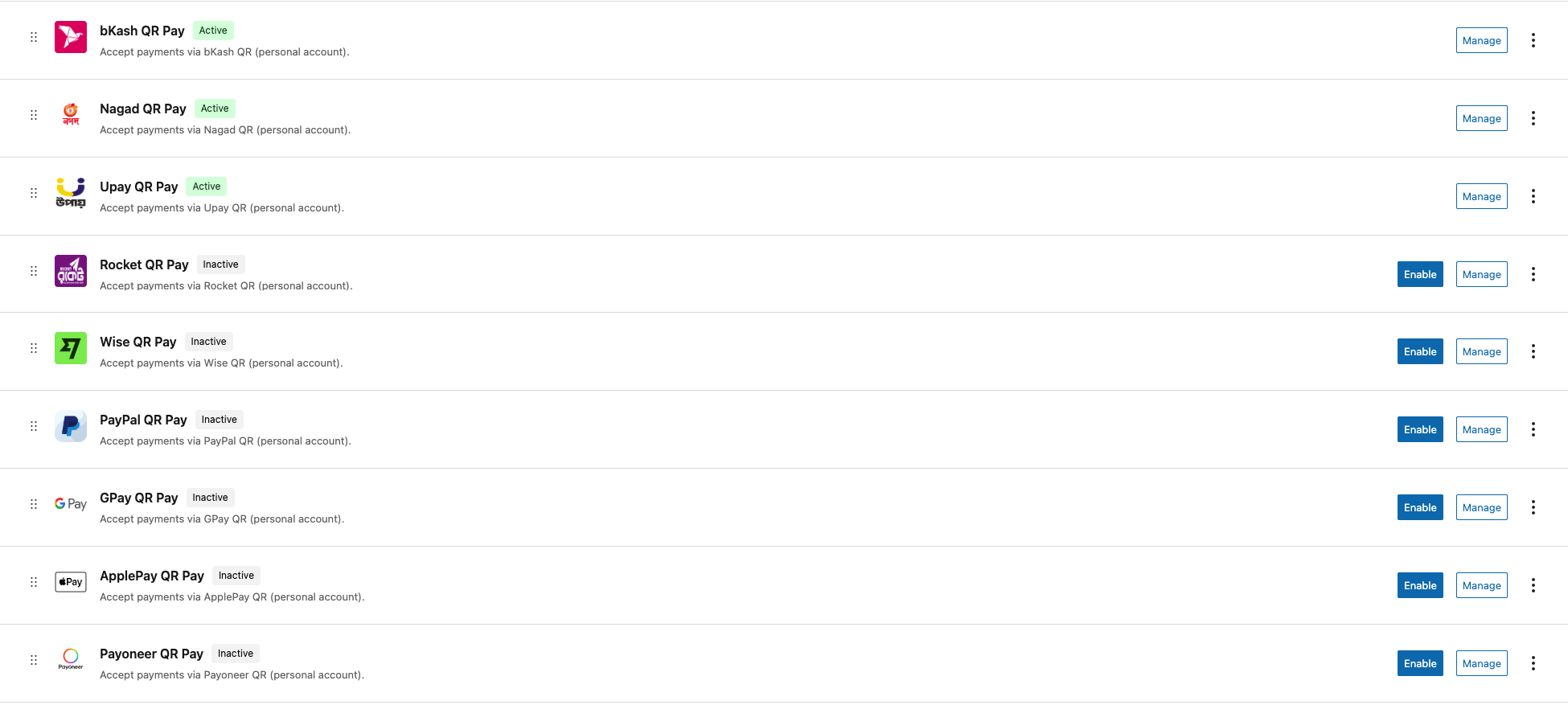 Accept QR-based manual payments in WooCommerce for 25+ popular global wallet providers including bKash, Nagad, Paytm, Apple Pay, Google Pay, and more.